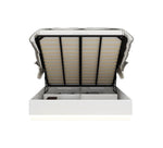 Upholstered Headboard: The grand bed features a plush headboard wrapped in gorgeous white vegan leather with a backlit inlay, providing both comfort and style.
